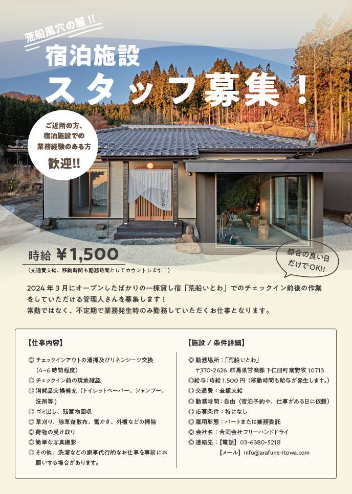 こんにちは!みらいポスティングスタッフです😁 群馬県安中市で宿泊施設様よりポスティングのご依頼をいただきました! 〇お客様情報(敬称略) 荒船いとわ 住所:群馬県甘楽郡下仁田町南野牧10713 お問い合わせ先:03638 …