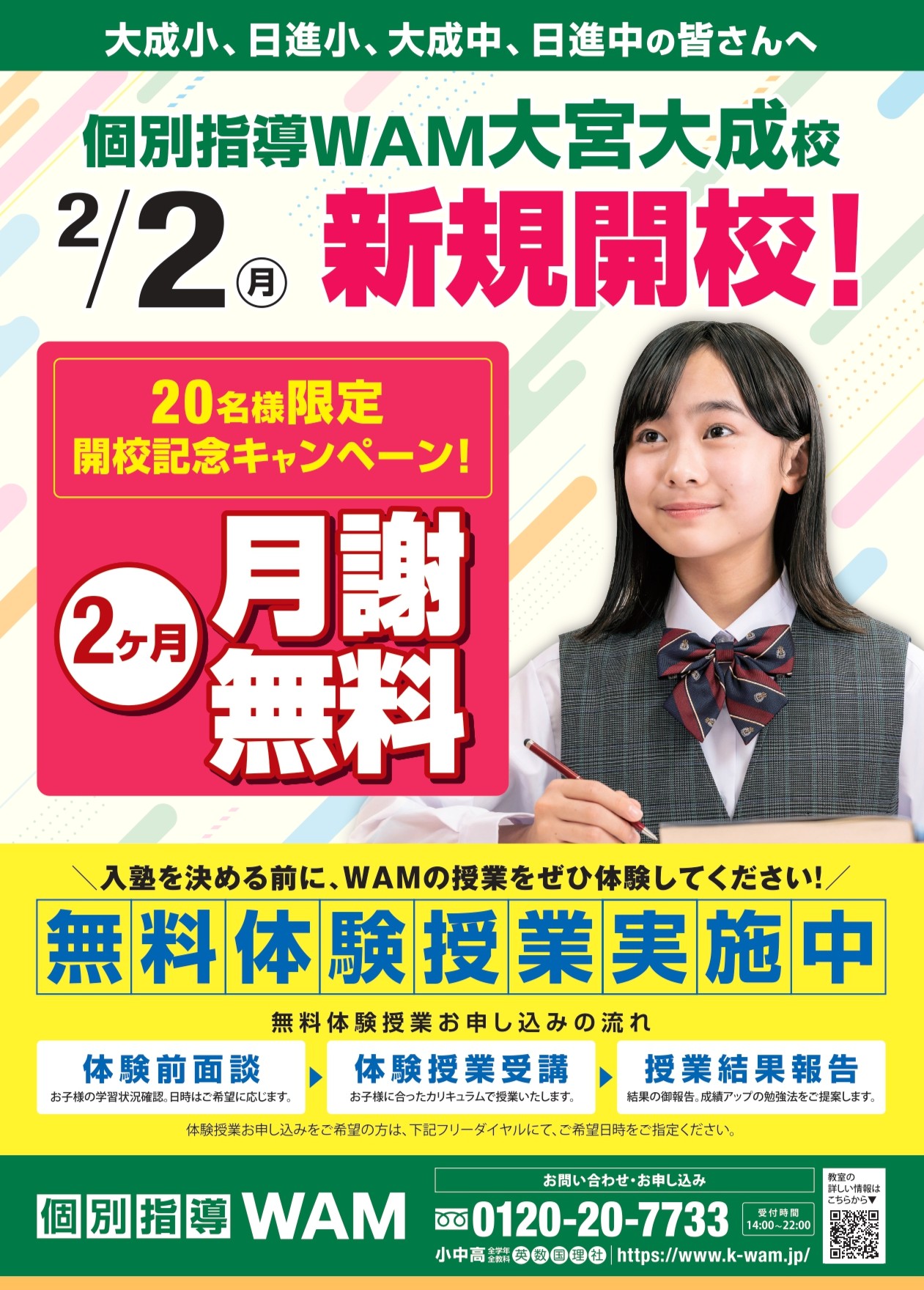 チラシ内容:新規開校、特典、特徴のご案内