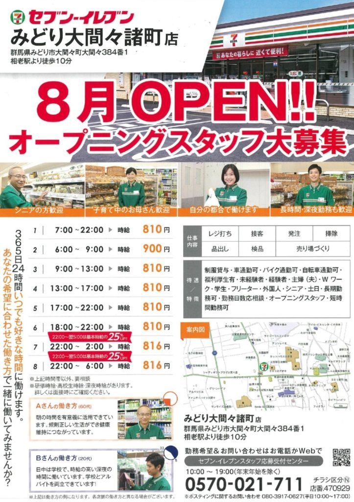 こんにちは、みらいポスティングスタッフです!今回は、群馬県みどり市のコンビニチェーン様からポスティングのご依頼を頂きました。 〇お客様情報(敬称略) セブンイレブンスタッフ応募受付センター お問い合わせ先:0570021 …